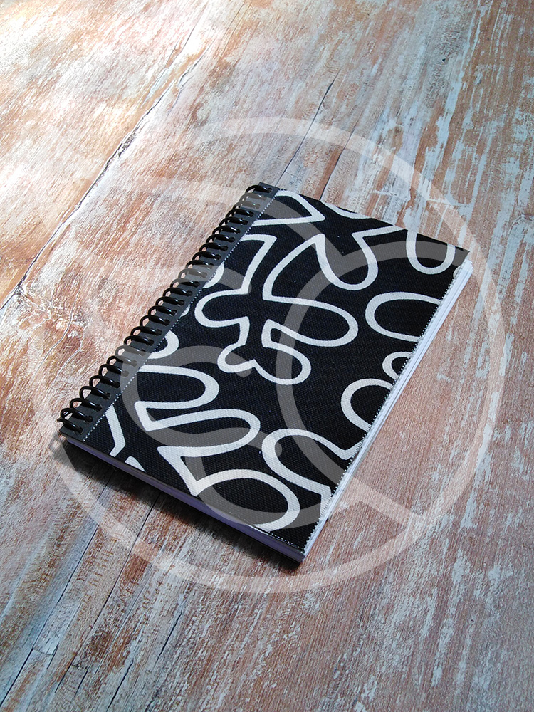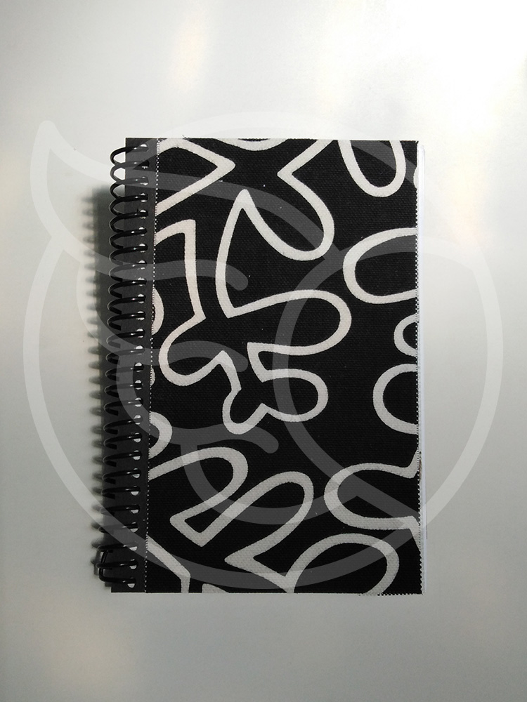 Block pequeño, con tela estampada negro y blanco. 75 hojas blancas.
