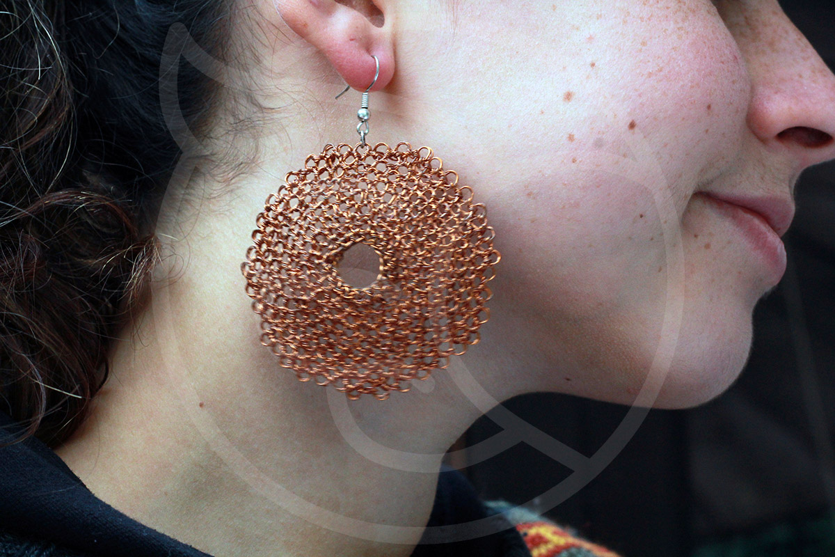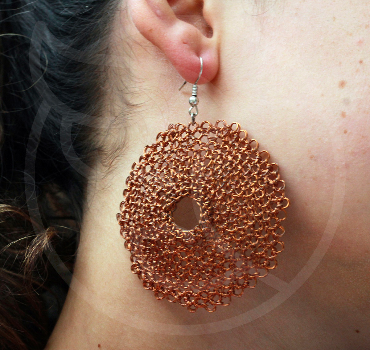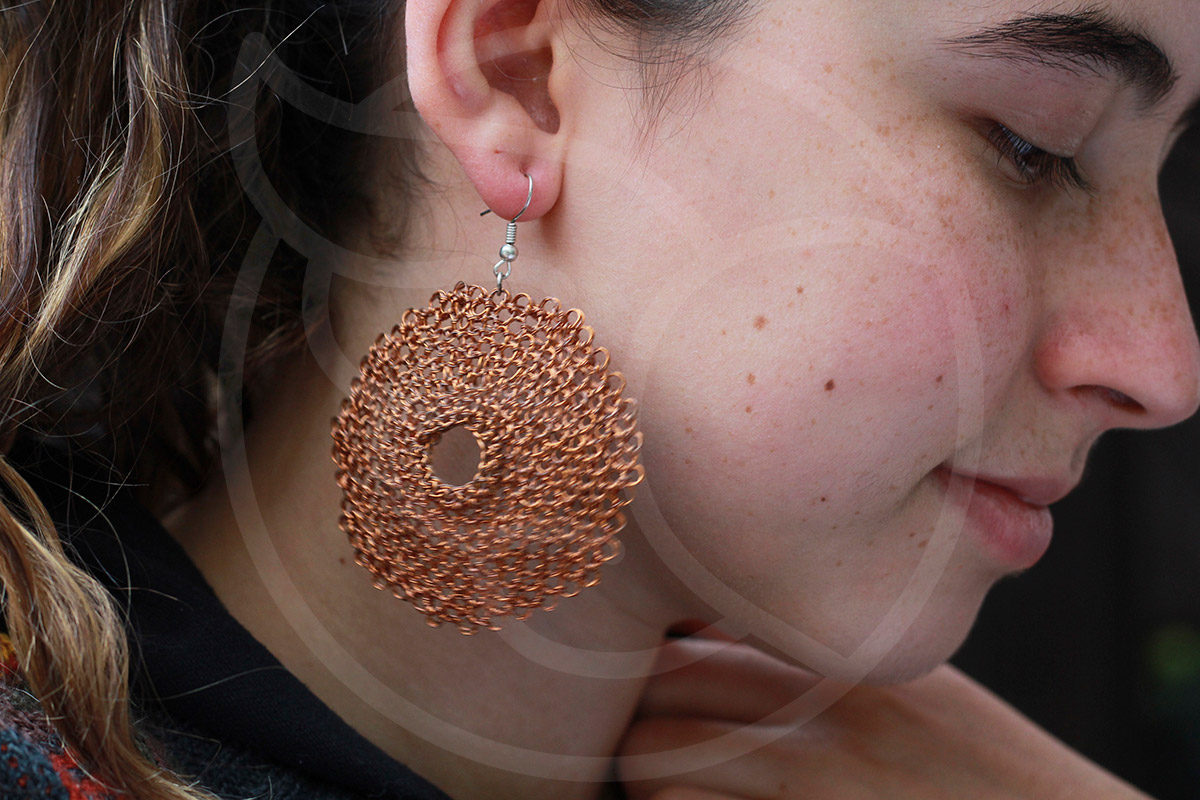 Aros tejidos a mano con hilo de cobre esmaltado en color natural y ganchos de acero quirúrgico. Tiempo mínimo de entrega 48 horas.
