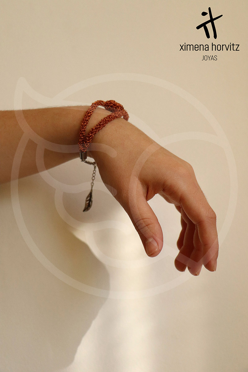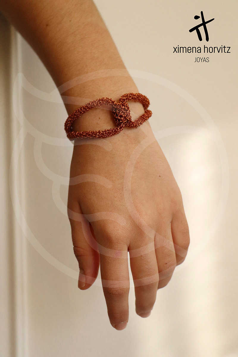 Pulsera ajustable tejida a mano con hilo de cobre esmaltado y color natural. Tiempo mínimo de entrega 48 horas.