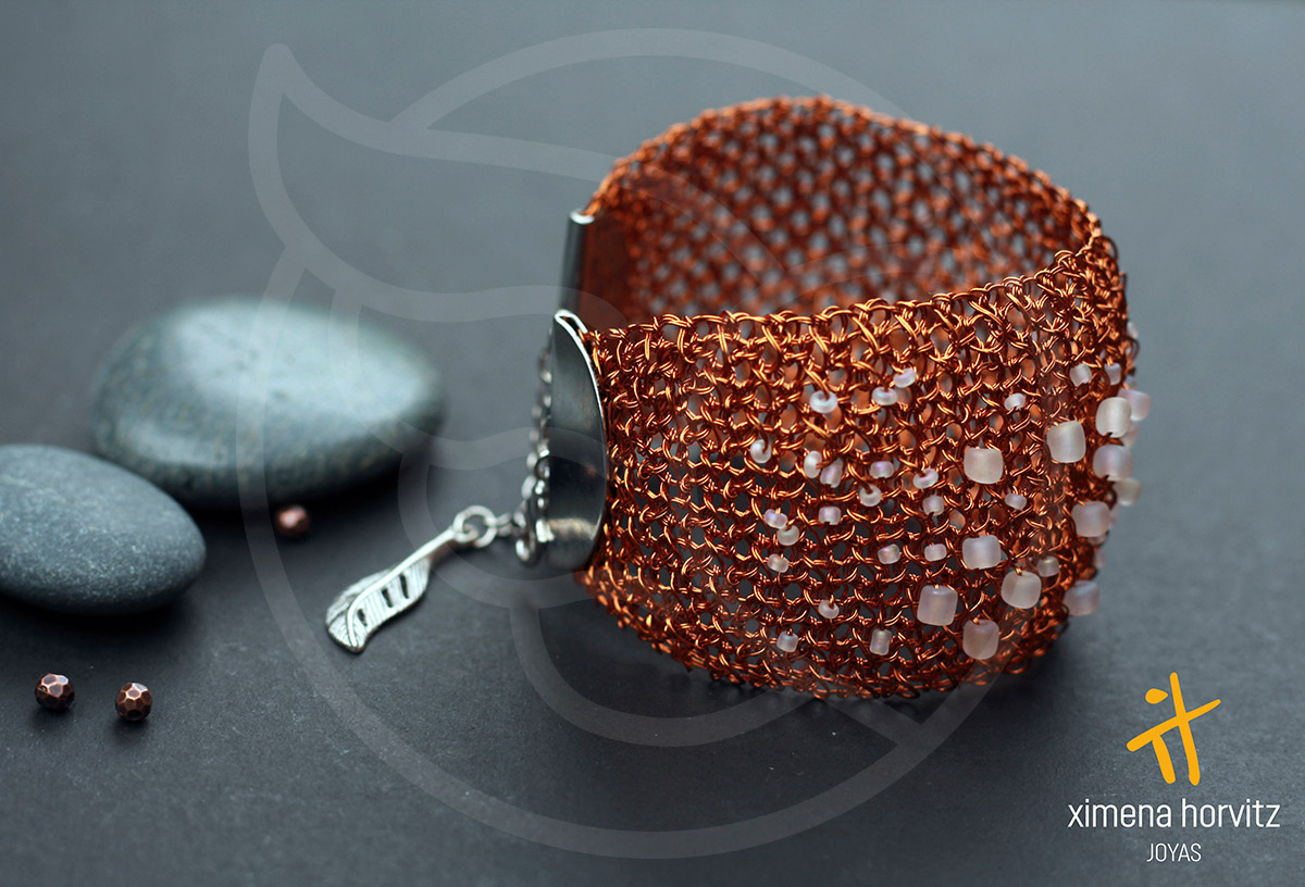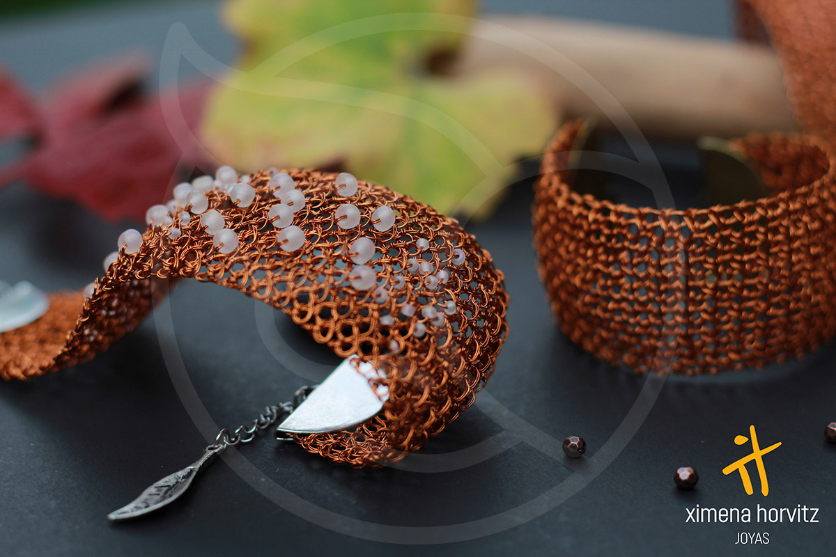Variedad de brazaletes anchos tejidos a mano con hilo de cobre esmaltado y color natural. Tiempo mínimo de entrega 48 horas. Ximena Horvitz WSP +56 9 9434 9014