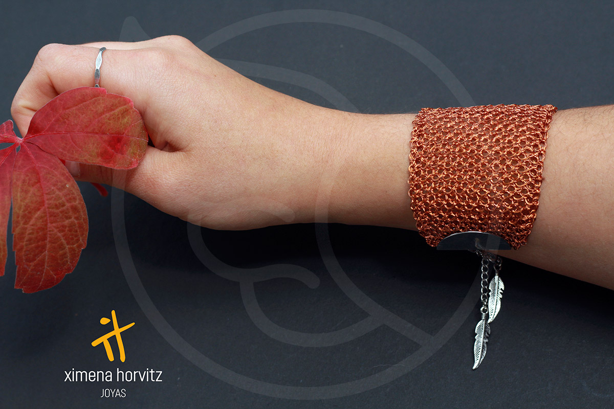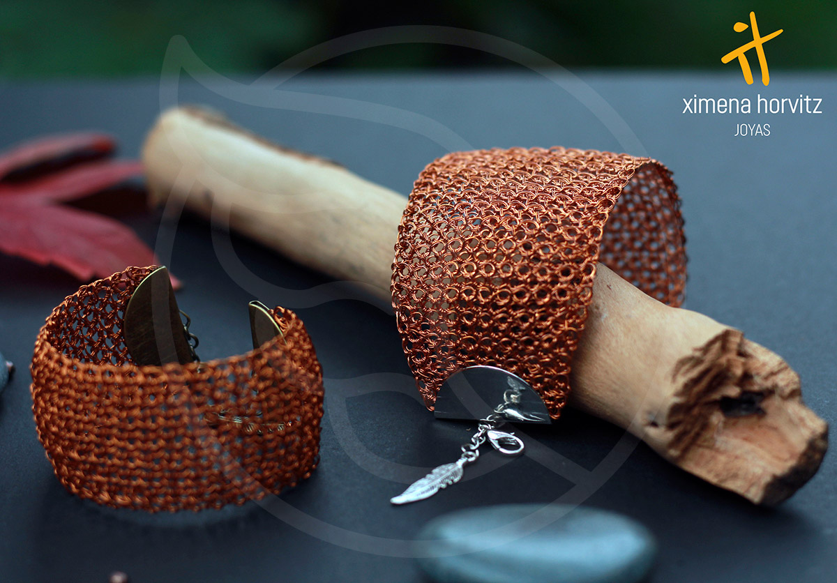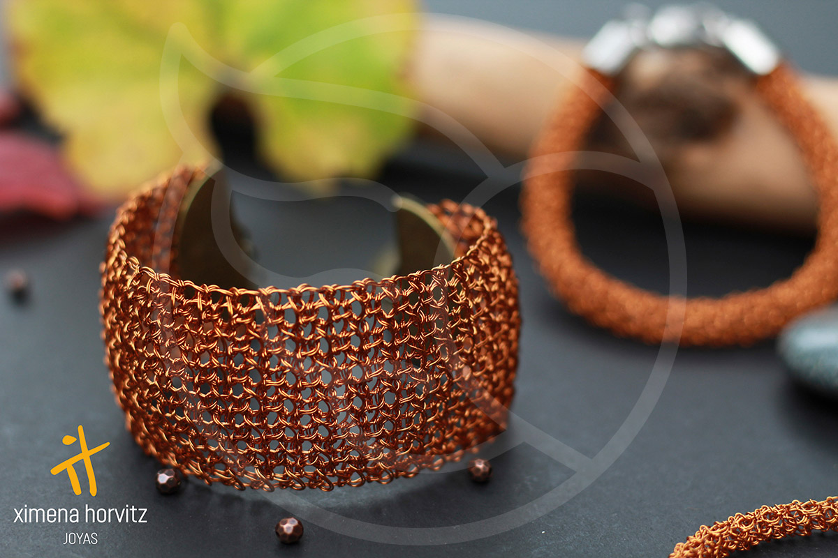 Variedad de brazaletes anchos tejidos a mano con hilo de cobre esmaltado y color natural. Tiempo mínimo de entrega 48 horas.