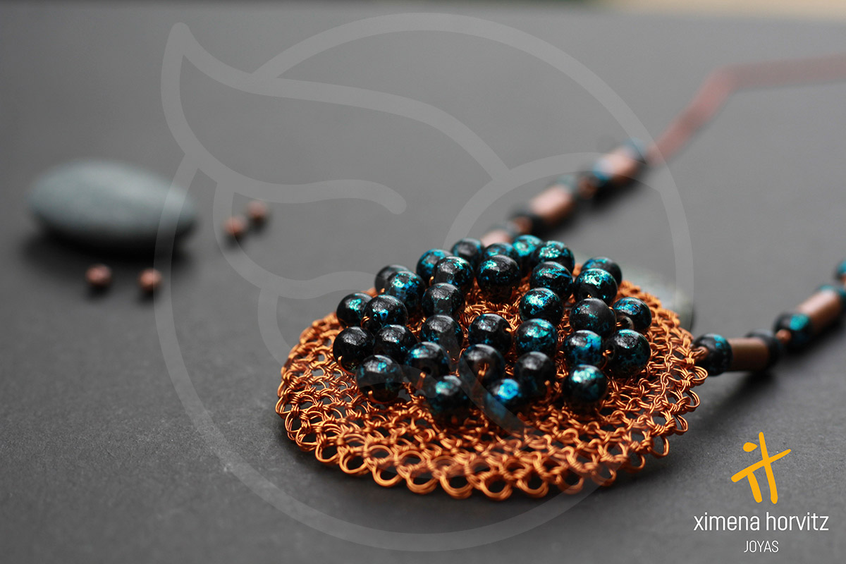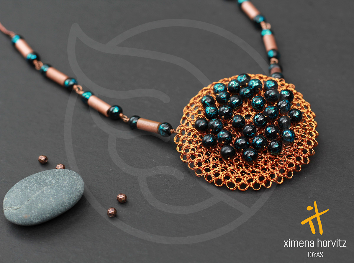 Collar tejido a mano con hilo de cobre esmaltado en color natural, cuentas de vidrio y tubos de cobre. Tiempo mínimo de entrega 48 horas. Ximena Horvitz WSP +56 9 9434 9014