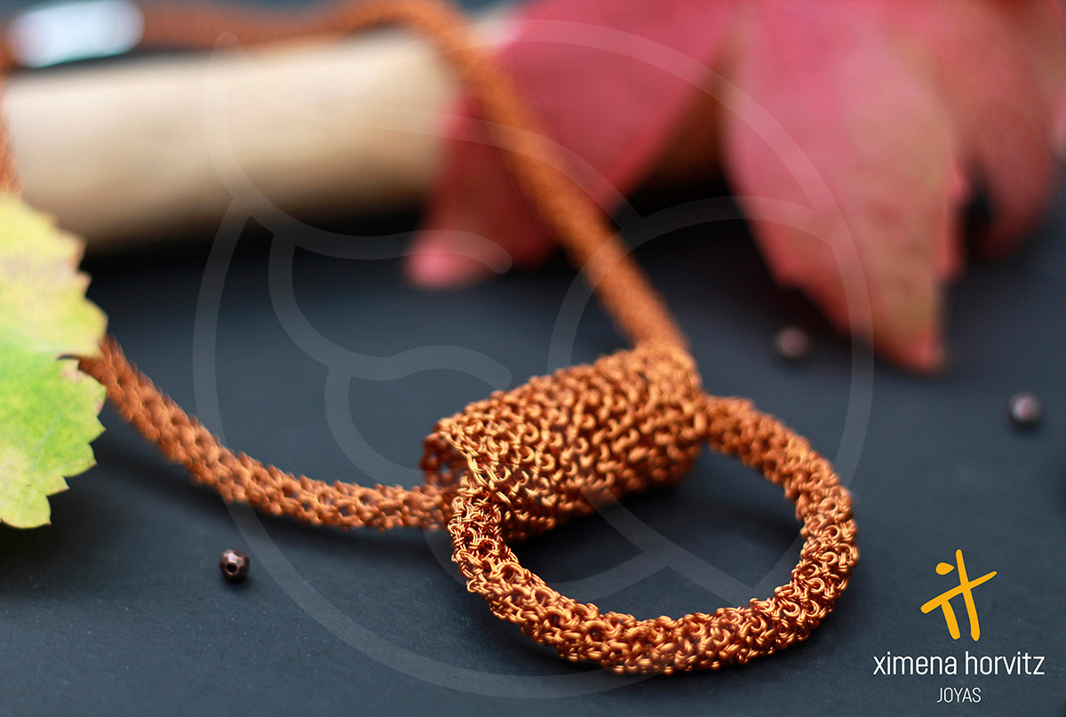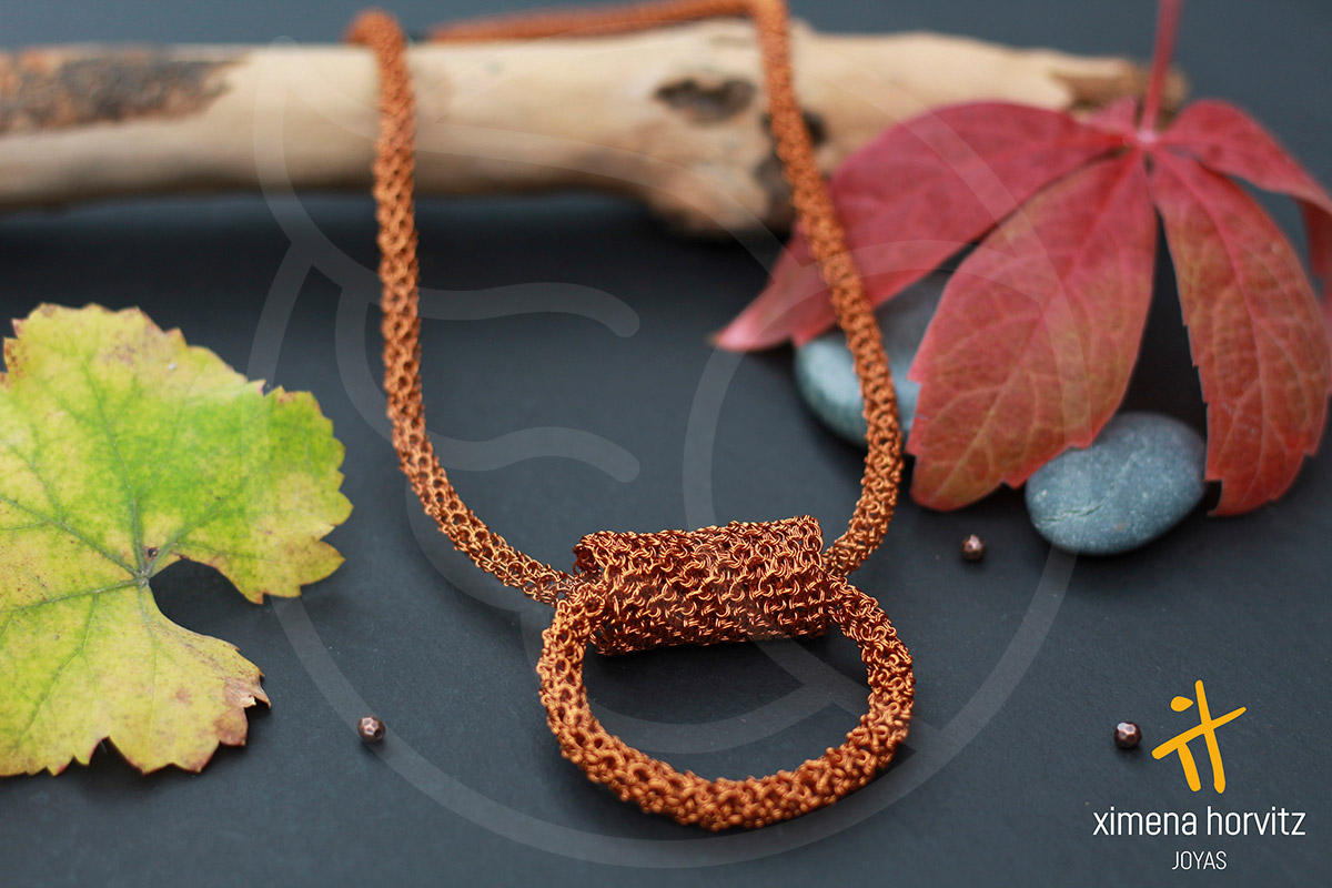 Collar tejido a mano con hilo de cobre esmaltado en color natural. Tiempo mínimo de entrega 48 horas.