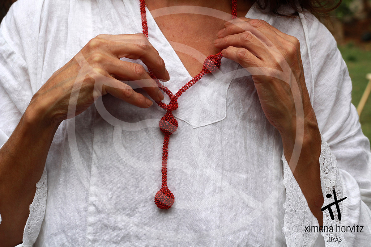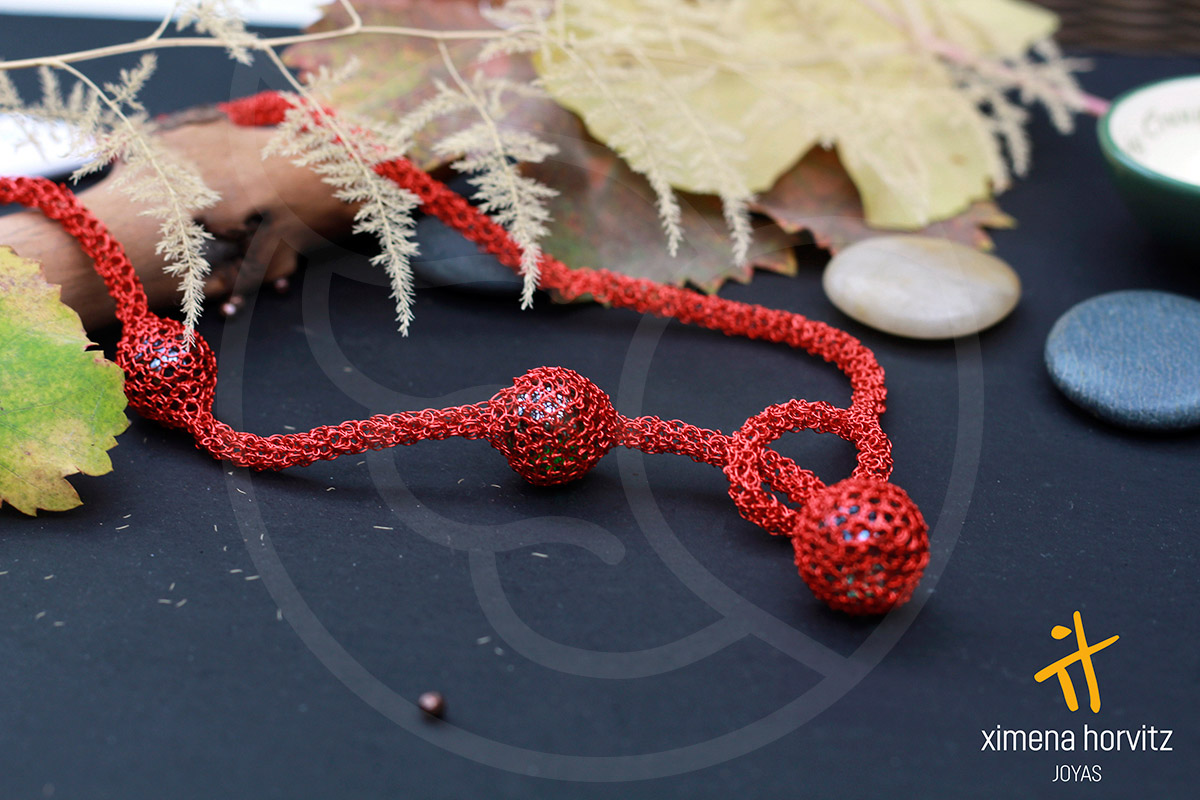 Collar ajustable a distintas posiciones tejido a mano con hilo de cobre esmaltado y color rojo. Tiempo mínimo de entrega 48 horas.