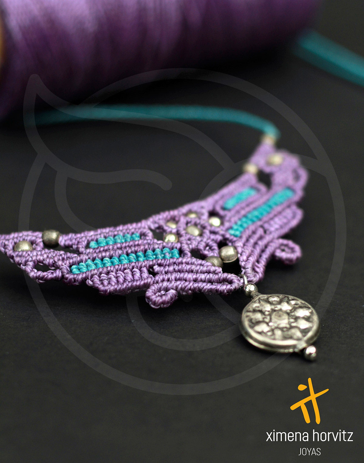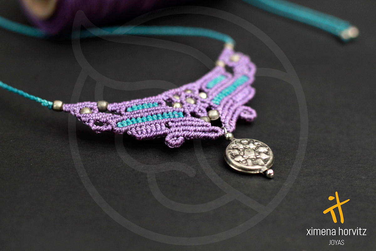 Collar ajustable tejido en macramé con dije y cuentas de latón. Tiempo mínimo de entrega 48 horas. Ximena Horvitz WSP +56 9 9434 9014