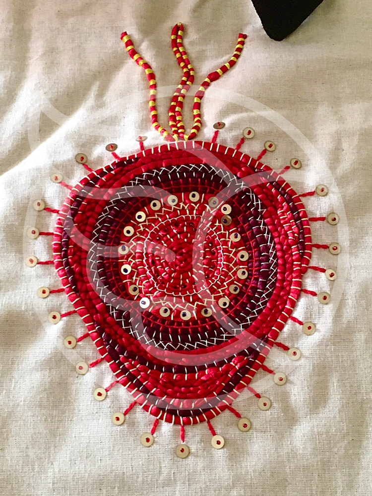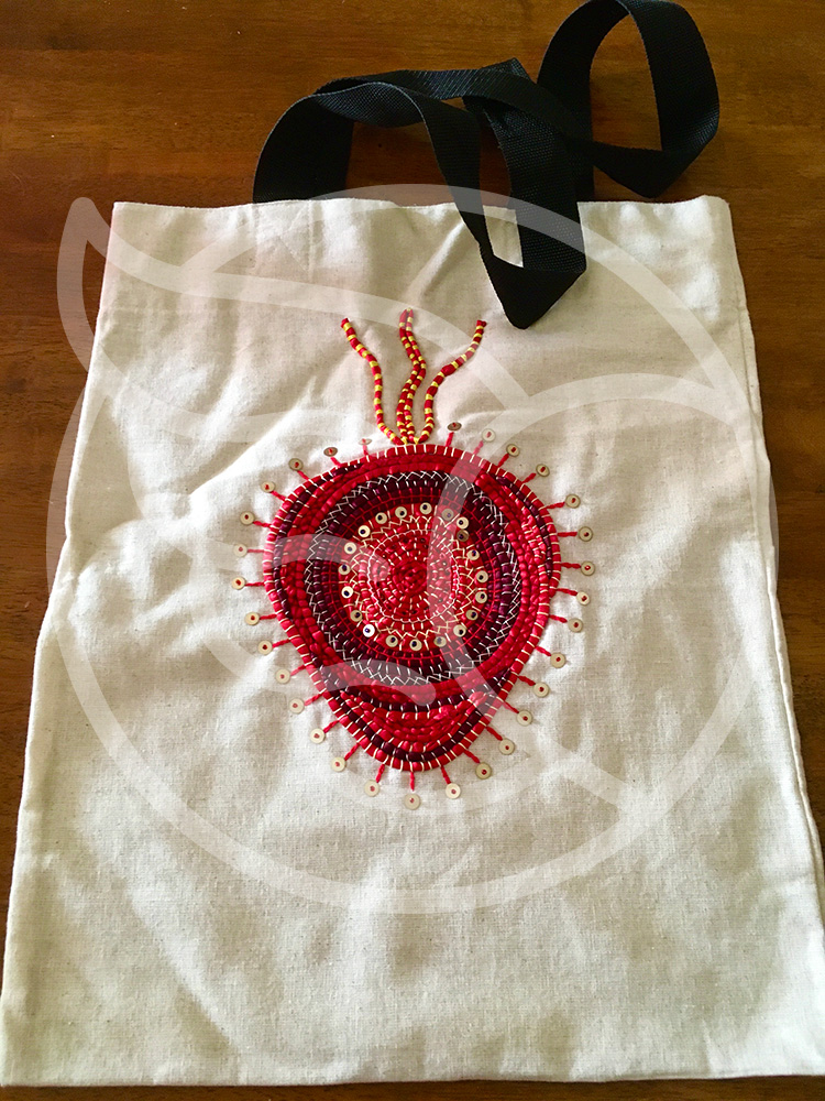 Bordado a mano, hilo telas, lentejuelas metálicas, mostacillas de vidrio. Bolso tela de algodón de 50x40 cms. Norma Ramírez Bustos +569 9342 2792