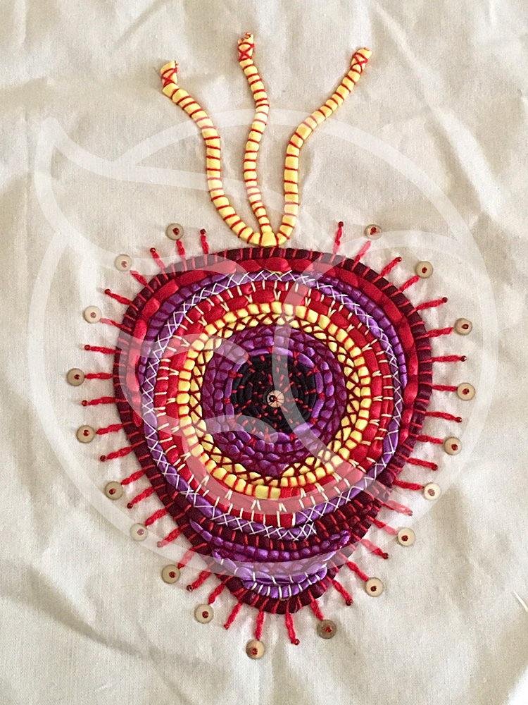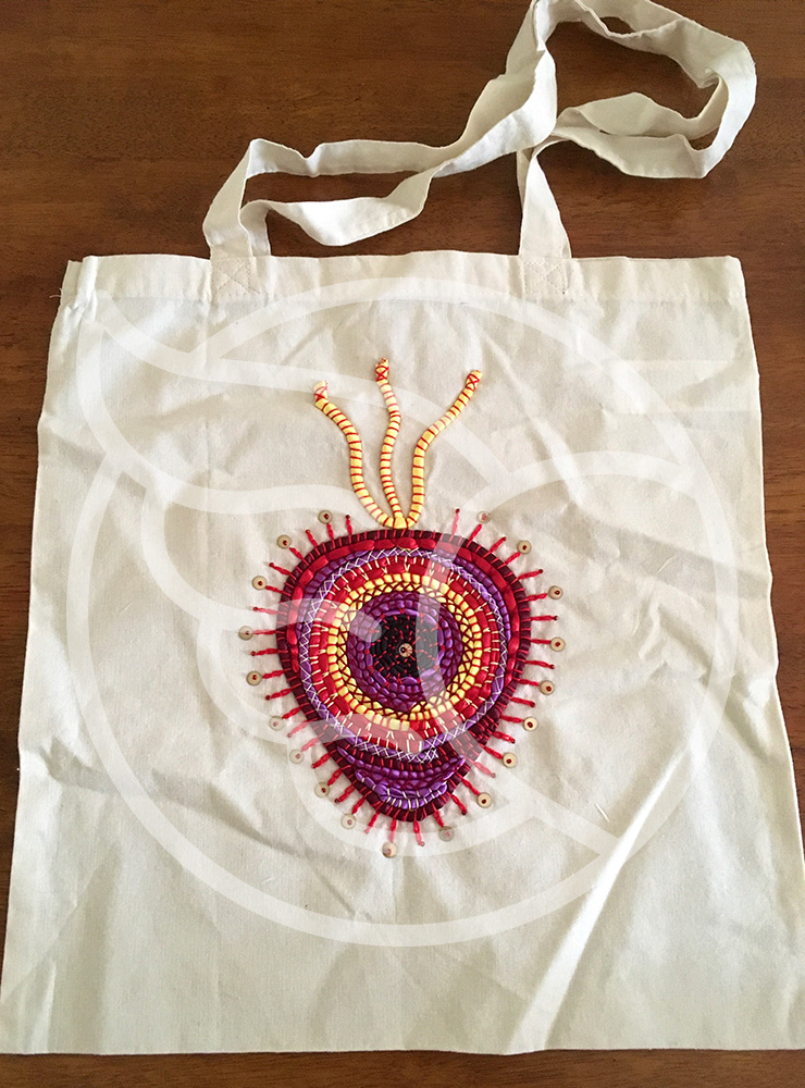 Bordado a mano, hilo telas, lentejuelas metálicas, mostacillas de vidrio. Bolso tela de algodón de 40x36 cms. Norma Ramírez Bustos +569 9342 2792